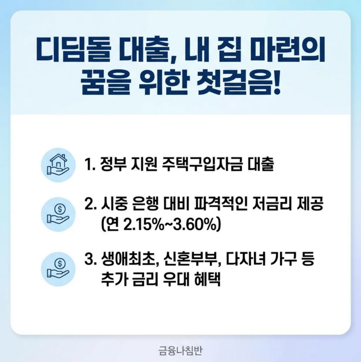 디딤돌 대출은 주택도시기금에서 운영하는 정부지원 주택구입자금 대출 상품입니다. 무주택 서민과 실수요자가 저렴한 금리로 내 집을 마련할 수 있도록 지원하는 것이 목적이며, 시중은행 주택담보대출보다 훨씬 낮은 금리가 가장 큰 장점입니다.
