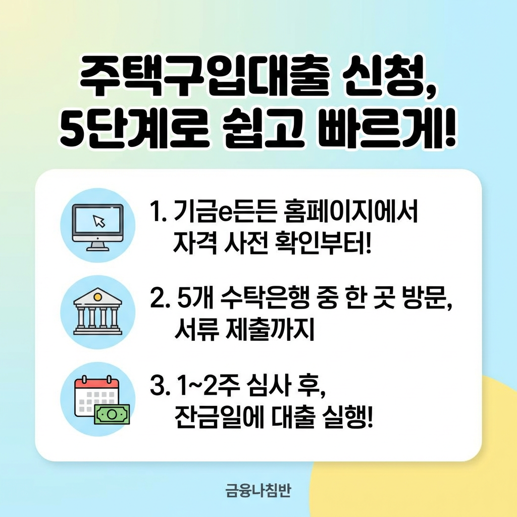 1단계 - 자격 사전확인: 기금e든든 홈페이지(enhuf.molit.go.kr)에서 본인의 자격 여부를 사전 조회합니다. 소득, 자산, 무주택 여부를 미리 확인할 수 있습니다.