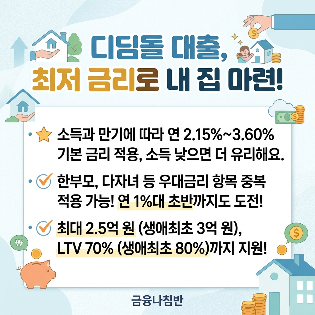 일반 은행 주택담보대출 금리가 연 4%~6% 수준인 것에 비해, 디딤돌 대출은 연 2.15%~3.60%의 파격적인 저금리를 제공합니다. 이자 부담이 크게 줄어들기 때문에 자격 조건에 해당된다면 반드시 먼저 알아보셔야 할 상품입니다.