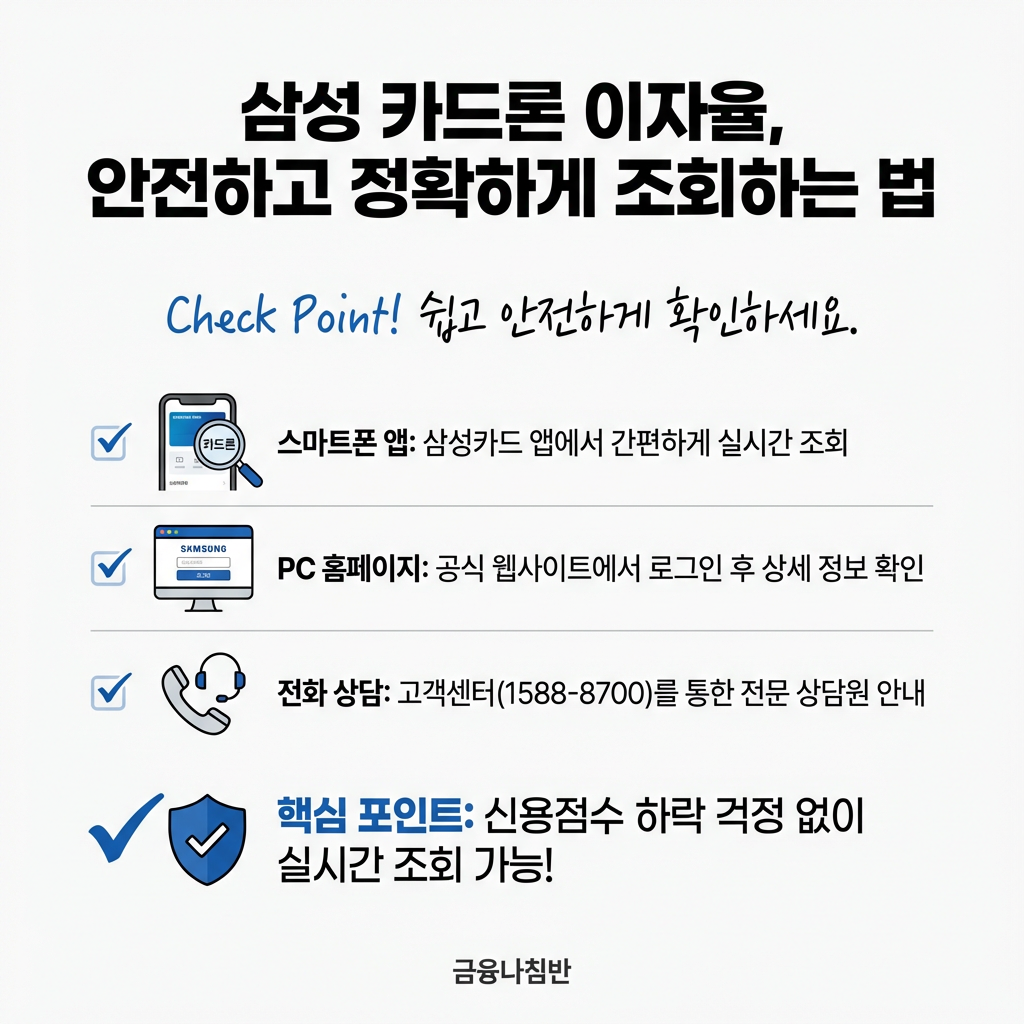 - 공식 채널 확인: 정확한 이자율은 삼성카드 앱, 홈페이지 또는 고객센터를 통해 본인 인증 후 조회하는 것이 가장 확실합니다.