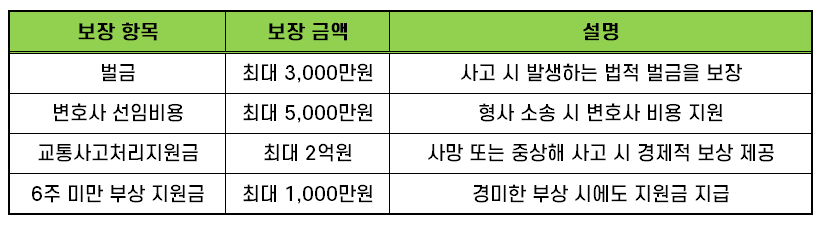 - 필수 보장: 벌금, 변호사 선임비용, 교통사고처리지원금